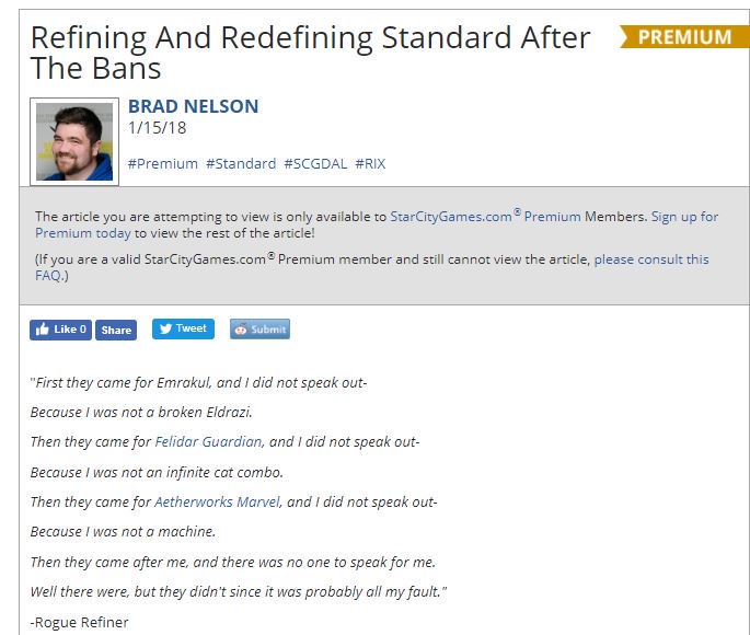 ako dobro pratim, nijedna varijanta standarda od kad su se kanovi izrotirali nije preskocila ban (ako se gleda samo koja kombinacija blokova je tu. poneki set se provukao tu i tamo). i skoro sve su bile karte iz kaladesha (reflector mage, i sada monored banovi jedini izuzeci. emrakula je ubio marvel). da bude gore, stalno se vracaju na istu ediciju da banuju. sjebali su sa energijom jako, te karte nigde ne vide igre mimo standarda, i nisu za svo ovo vreme smislili nista da poprave tu gresku. po meni, energija / kaladesh im je najgori propust ikad, uzevsi u obzir kad se desio (nakon 20+ godina iskustva) i koliko su te karte zapravo imale malo uticaja van standarda (copter i saheeli cat pomalo vide igre u modernu, ostalo 0). na kraju, cak i ona skracena rotacija, koja je trebala da postoji, ovde nije izgovor (kaladesh bi uvek bio u kombinaciji,i sa inistradom, i sa amonketom/ixalanom). prilicno porazavajuce za njihovo testiranje.