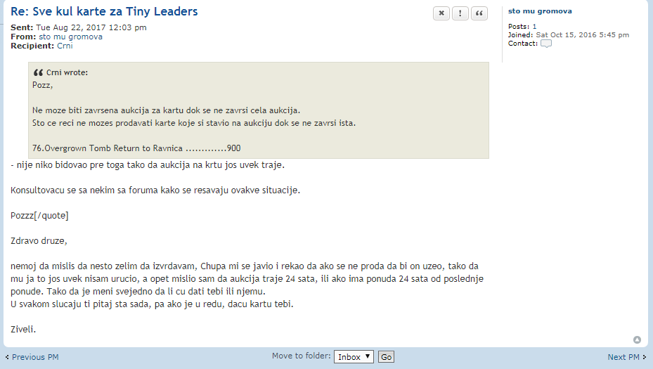 Moja je stvar sto mogu da dam tako jak bid i sto zelim bas taj tomb. Moj tomb je otisao u NS. Foil. Prodat. Treba mi ovaj da ne jurim. Opet se objasnjavam. A ne treba mi to.....